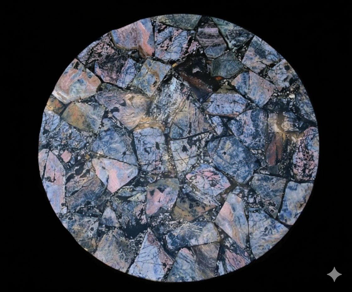A 20-inch polished Jasper stone tabletop featuring a twilight-inspired palette of blues, purples, and muted pink tones — crafted to elevate any luxury living space.
